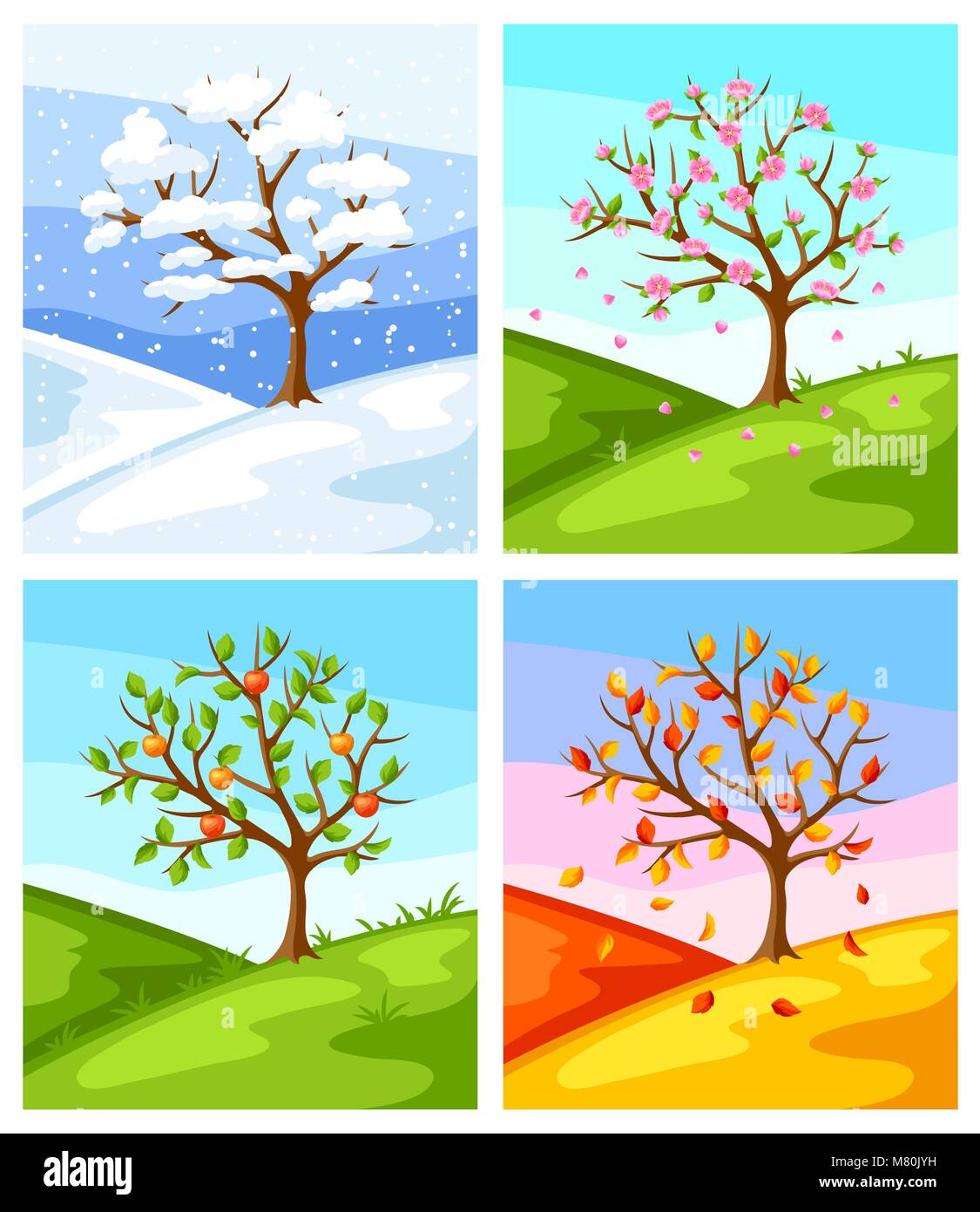Quatre saisons. Illustration de l'arbre et le paysage en hiver, printemps, été, automne Vecteurs