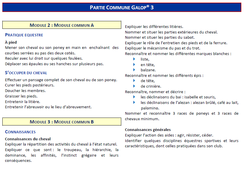 Le Galop 3 se compose de la partie spécifique du Galop 3, plus de la partie commune à tous les Galops 3.. Partir au galop sur le bon pied du pas ou du trot sur une courbe. Accélérer et ralentir aux trois allures.. Expliquer le mécanisme du pas et du trot. Reconnaître et nommer les différentes marques blanches : liste, en tête.