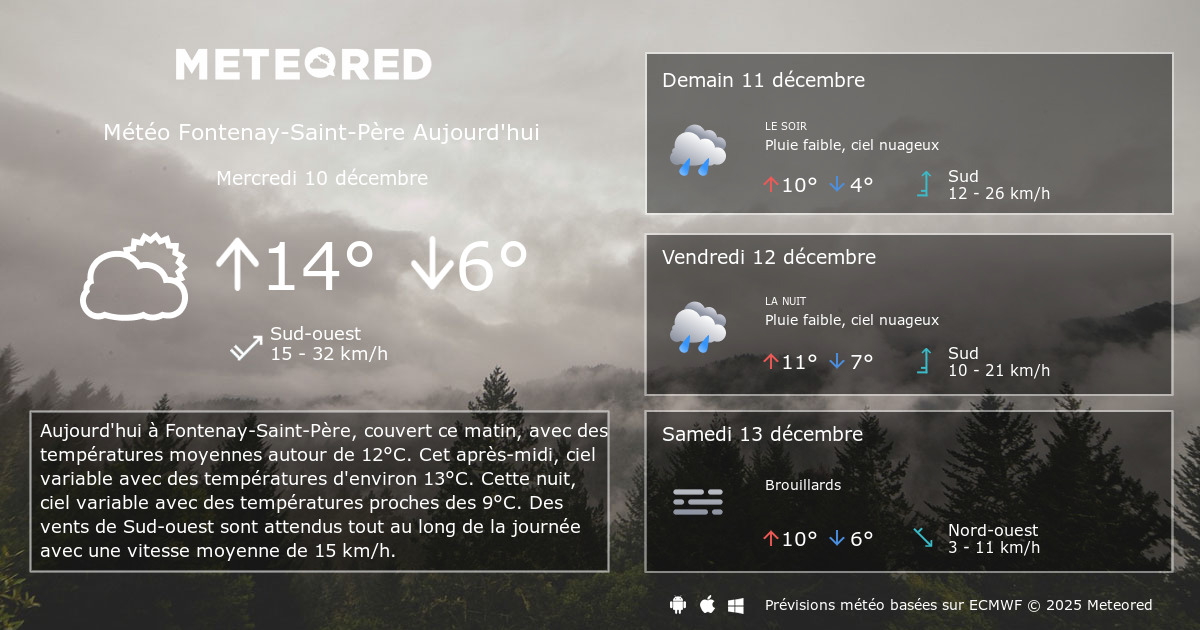 L'humidité sera de 94%. Aujourd'hui, l'après-midi, le temps à Le Val-Saint-Père sera couvert. Concernant les températures, il faudra compter sur un maximum de 10°C pour 8°C ressenti. Le vent à Le Val-Saint-Père quant à lui sera de sud-ouest avec une vitesse maximale de 15km/h.