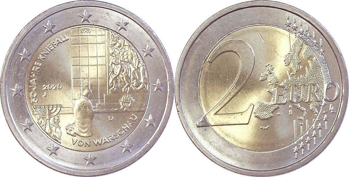 2-Euro-Münze "Kniefall von Warschau". In diesem Jahr erscheint noch eine weitere, ganz besondere 2-Euro-Gedenkmünze. Sie würdigt den historisch bedeutsamen „Kniefall von Warschau" des damaligen Bundeskanzlers Willy Brandt am 7. Dezember 1970 vor dem Mahnmal zum Gedenken an den jüdischen Ghetto-Aufstand von 1943.