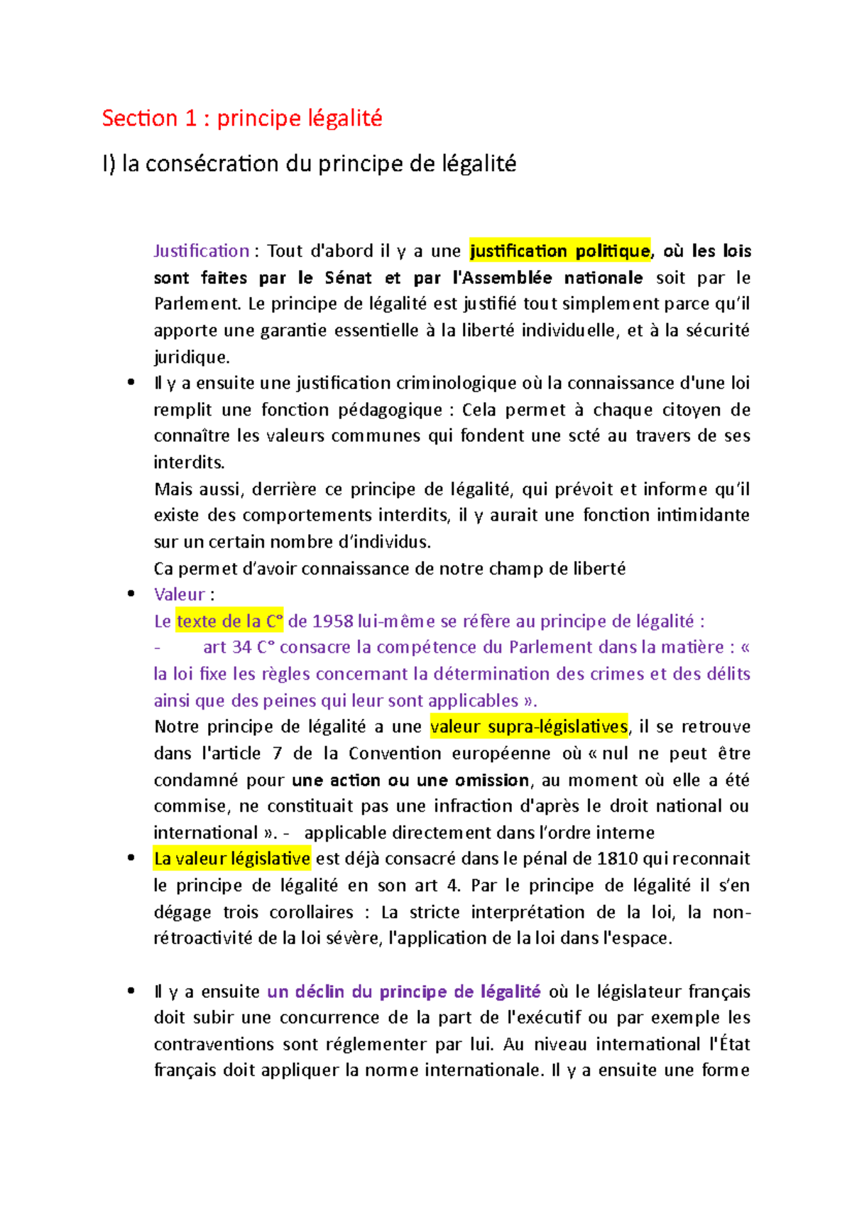Fiche droit pénale oral Section 1 principe légalité I) la consécration du principe de
