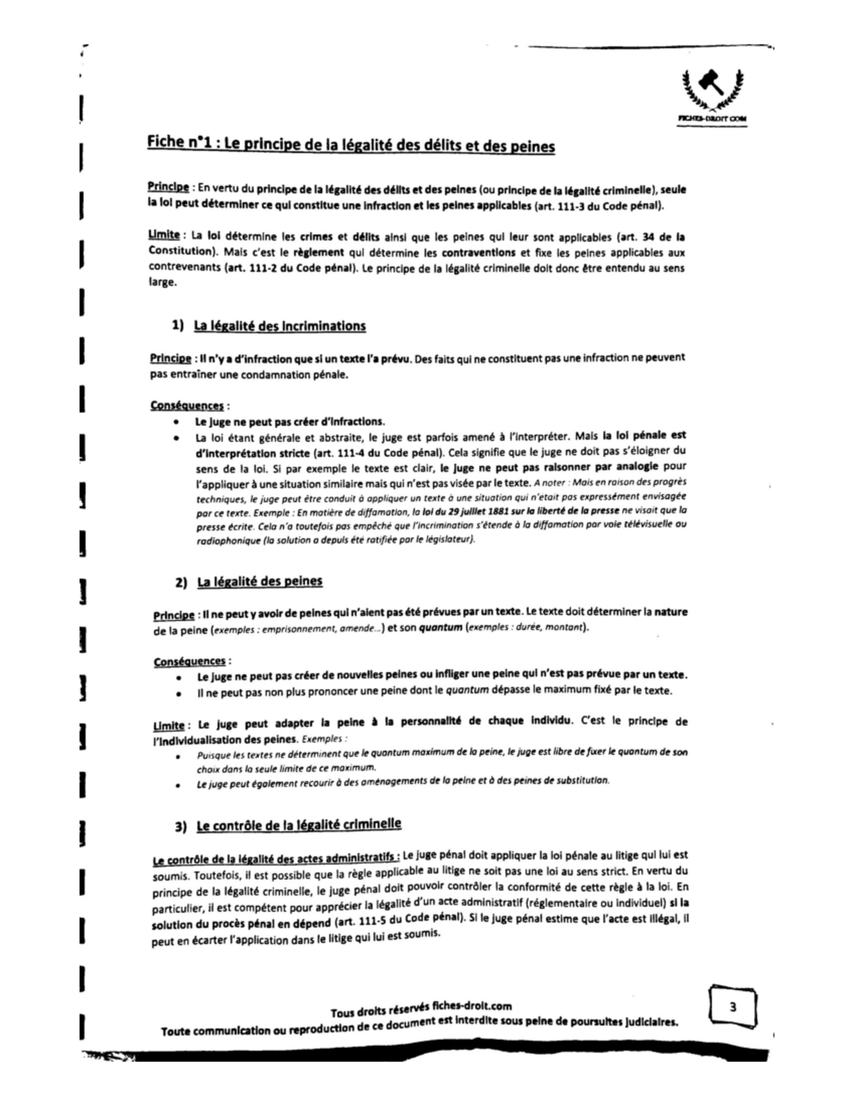 Fiche n°1 Le principe de la légalité des délits et des peines Droit pénal Studocu