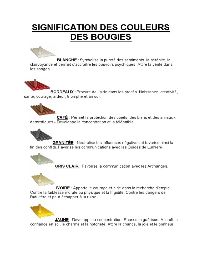 SIGNIFICATION DES COULEURS DES BOUGIES BLANCHE : Symbolise la pureté des sentiments, la sérénité, la clairvoyance et permet d'accroître les pouvoirs psychiques. Attire la vérité dans les songes. BORDEAUX : Procure de l'aide dans les procès. Naissance, créativité, santé, courage, ardeur, triomphe et amour.