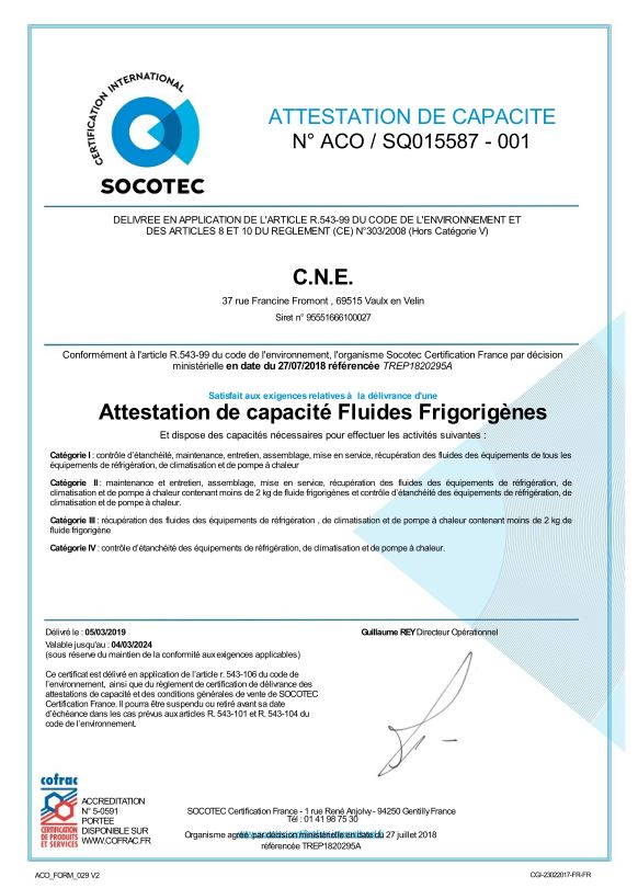 L'attestation de capacité est une certification exigée par la règlementation. Elle est obligatoire pour tous les opérateurs manipulant des fluides frigorigènes et est délivrée pour une durée maximale de 5 ans par un organisme agréé tels que SOCOTEC Certification France.