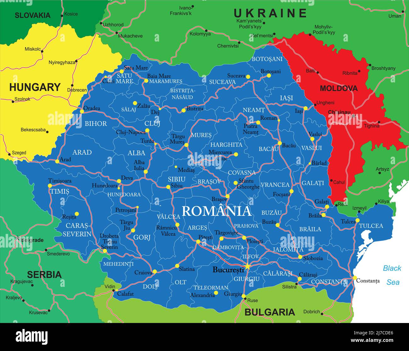 Carte vectorielle très détaillée de la Roumanie avec régions administratives, principales villes
